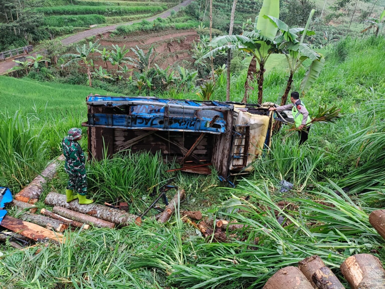 Akibatnya, kendaraan terperosok ke ladang warga dan terguling. Muatan kayu pun berhamburan di lokasi kejadian.