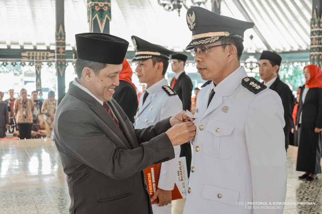 Bupati Wonosobo Afif Nurhidayat menyematkan tanda jabatan kepada Camat Watumalang, Arif Hardiyanto. ( LT/ dok. prokompim).