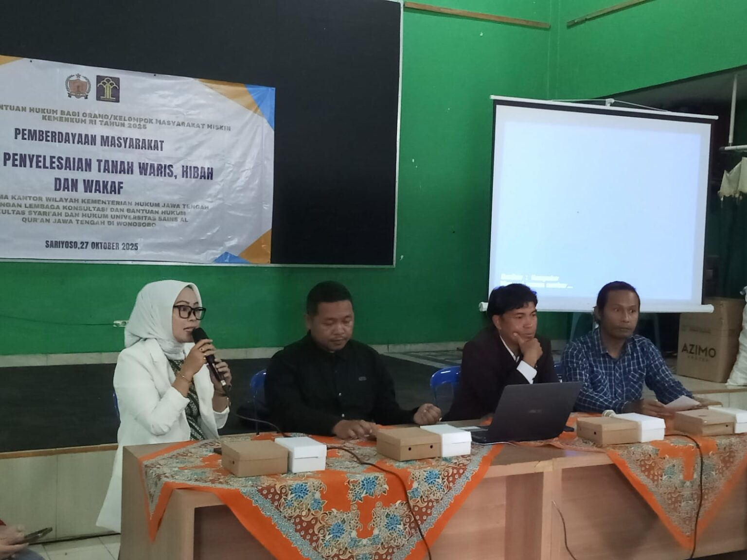 Wonosobo (LintasTopik.Com) – Unsiq Halal Centre (UHC) bersama Lembaga Konsultasi dan Bantuan Hukum (LKBH) Universitas Sains Al-Qur’an (Unsiq) menggelar kegiatan edukasi hukum bertajuk “Pemberdayaan Masyarakat: Teknik Penyelesaian Tanah Waris, Hibah, dan Wakaf” di Desa Sariyoso, Kecamatan Wonosobo, Senin (27/10/2025).