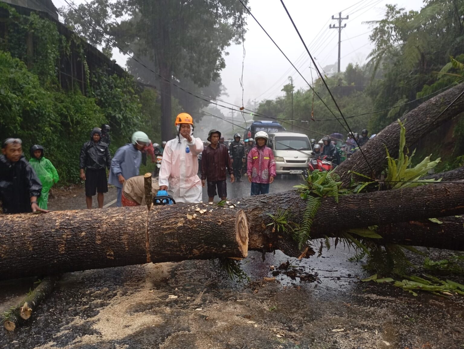 Batang pohon yang besar menutup hampir seluruh akses jalan, menyebabkan kemacetan panjang. Sejumlah pengendara terpaksa menunggu proses evakuasi, sementara lainnya memilih mencari jalur alternatif.