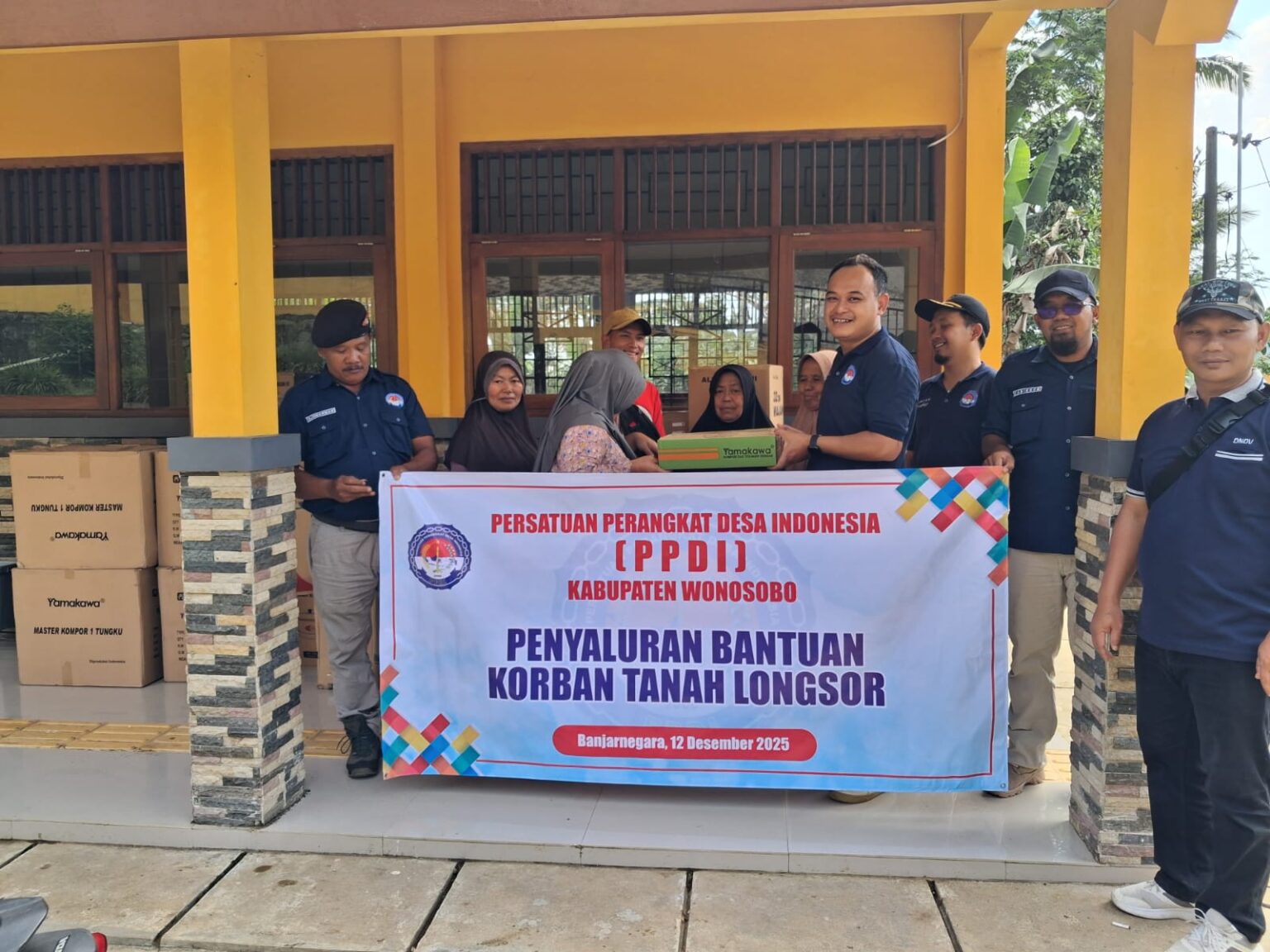 Banjarnegara (Lintas Topik.com) — Pengurus Persatuan Perangkat Desa Indonesia (PPDI) Kabupaten Wonosobo menyalurkan bantuan peralatan dapur senilai Rp15,7 juta kepada pengungsi korban longsor di Desa Pandanarum, Banjarnegara, Jumat (12/12/2025).