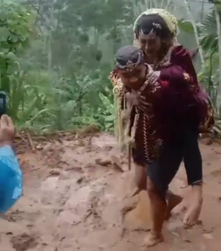 Dalam video yang kini viral di media sosial, pengantin pria tampak menggendong istrinya melewati jalan berlumpur dan tertutup longsoran tanah sambil disemangati warga sekitar.
