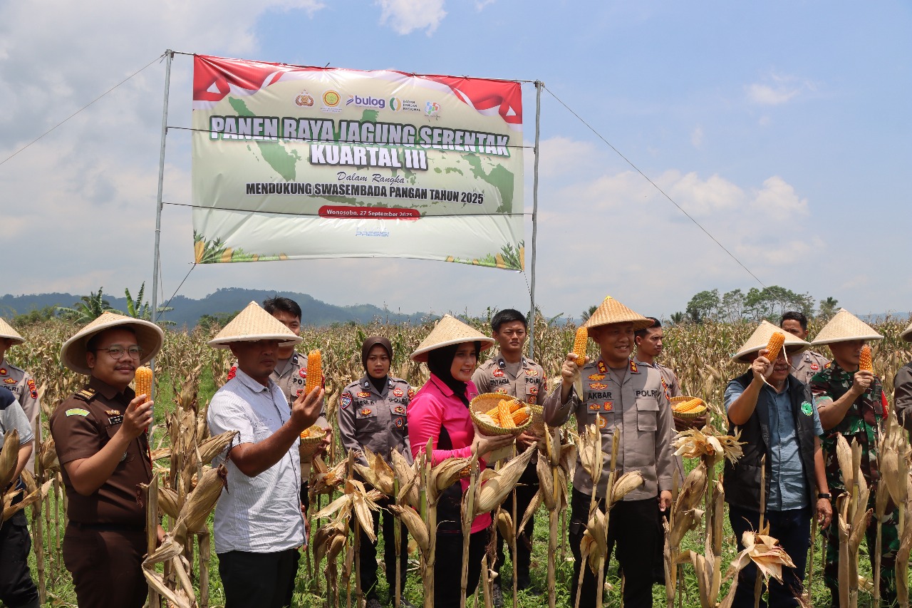 Sabtu (27/9/2025), Polres Wonosobo bersama Forum Komunikasi Pimpinan Daerah (Forkopimda) dan masyarakat Desa Surengede, Kecamatan Kertek, menggelar Panen Raya Jagung Serentak Kuartal III Tahun 2025 di lahan seluas 5.000 meter persegi di Dusun Wironalan.